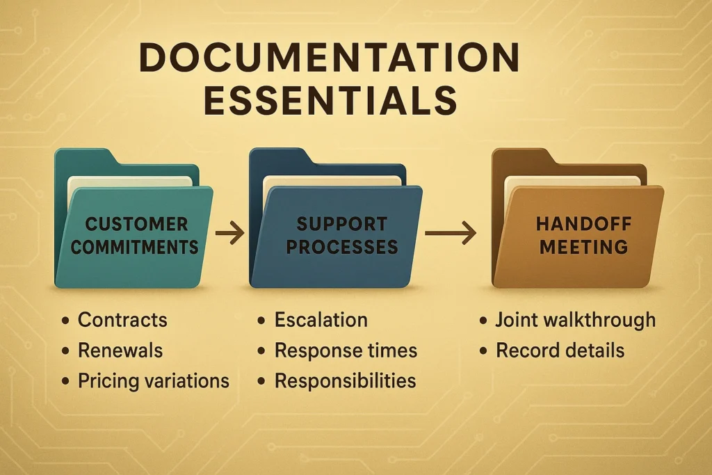 Start with contracts and commitments. Every promise ever made to a customer needs to be written down and honored. Missing these details leads to disappointed customers and quick cancellations. Include renewal dates, custom features, and any special pricing deals.