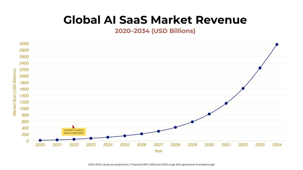 Market research projects growth to $2,973.14 billion by 2034. B2B software companies leverage AI for customer acquisition. Subscription models prove particularly effective for AI-enhanced services.